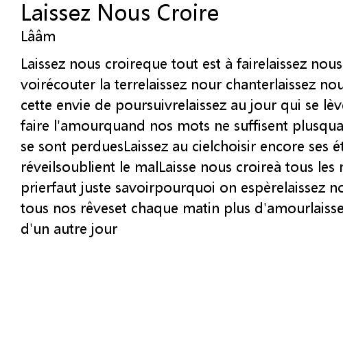 | Laissez nous croireque tout est a fairelaissez nous r verlaissez nour voire couter la terrelaissez nour chanterlaissez nou vivre tous nos r veset cette envie de poursuivrelaissez au jour qui se le vel' envie de revenirLaissez faire l' amourquand nos mots ne suffisent plusquand sur notre parcoursnos mains se sont perduesLaissez au cielchoisir encore ses e toilespour que nos re veilsoublient le malLaisse nous croirea tous les myste reslaissez nous prierfaut juste savoirpourquoi on espe relaissez nous pleurerlaissez nous vivre tous nos r veset chaque matin plus d' amourlaissez au monde qui se le vel' envie d' un autre jour |