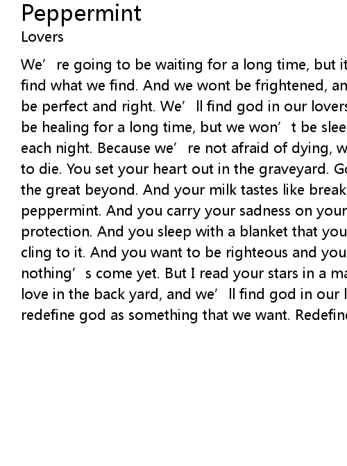 | We’re going to be waiting for a long time, but it’ll be worth it when we find what we find. And we wont be frightened, and we won’t be nervous, it’ll be perfect and right. We’ll find god in our lovers’ arms. We’re going to be healing for a long time, but we won’t be sleepless and we’ll get better each night. Because we’re not afraid of dying, we’re afraid of wanting never to die. You set your heart out in the graveyard. Go and get your heart back from the great beyond. And your milk tastes like breaking. And your wrists smell of peppermint. And you carry your sadness on your back like a tortoise, as protection. And you sleep with a blanket that you found on the pavement, and you cling to it. And you want to be righteous and you want to find guidance, but nothing’s come yet. But I read your stars in a mason jar and you’ll make love in the back yard, and we’ll find god in our lovers’ arms. We’ll redefine god as something that we want. Redefine god as something that you want. |
