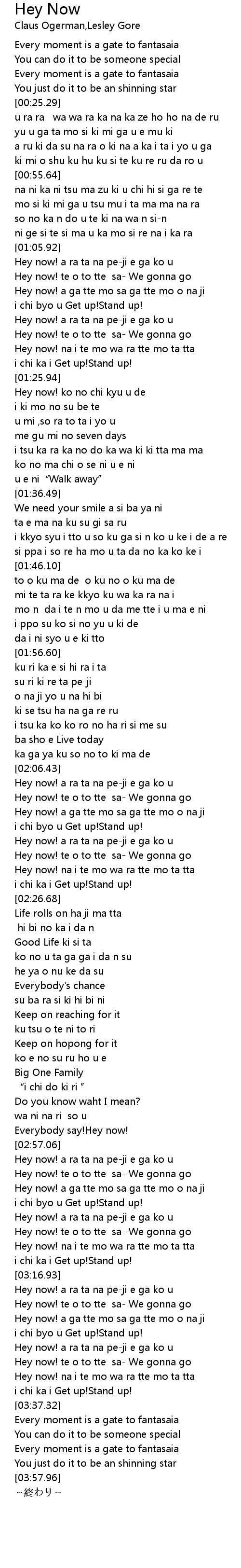 | [01:20.94] | Hey now! na i te mo wa ra tte mo ta tta |