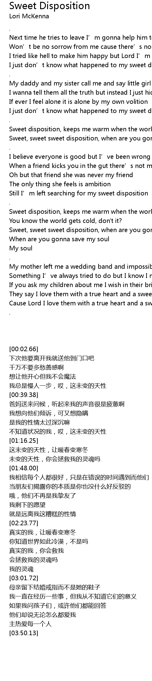 | [02:15.08] | Still I’m left searching for my sweet disposition |