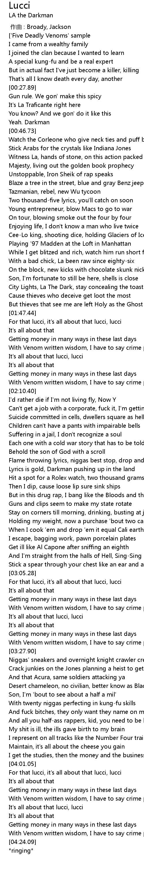 | [03:24.64] | With Venom written wisdom, I have to say crime pays, kid lucci |