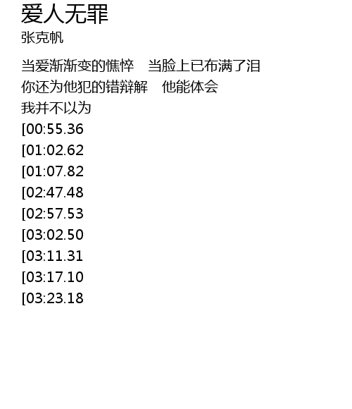 | [04:00.93][02:47.48][01:16.24] | 爱一个人怎会有罪 伤透的心如何安慰 |
