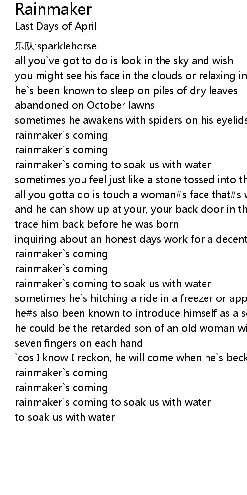 | [02:09.52] | rainmaker`s coming to soak us with water |