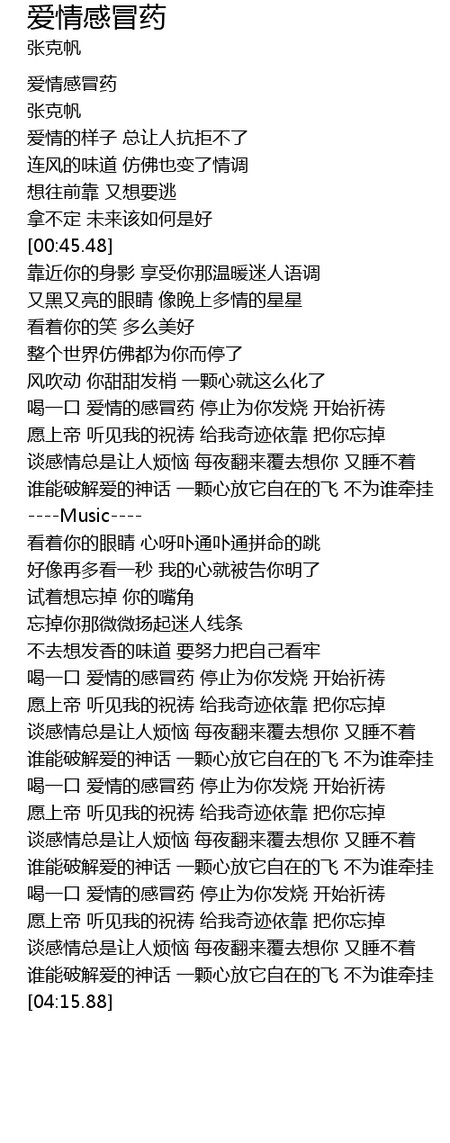 | [02:39.77] | 喝一口 爱情的感冒药 停止为你发烧 开始祈祷 |