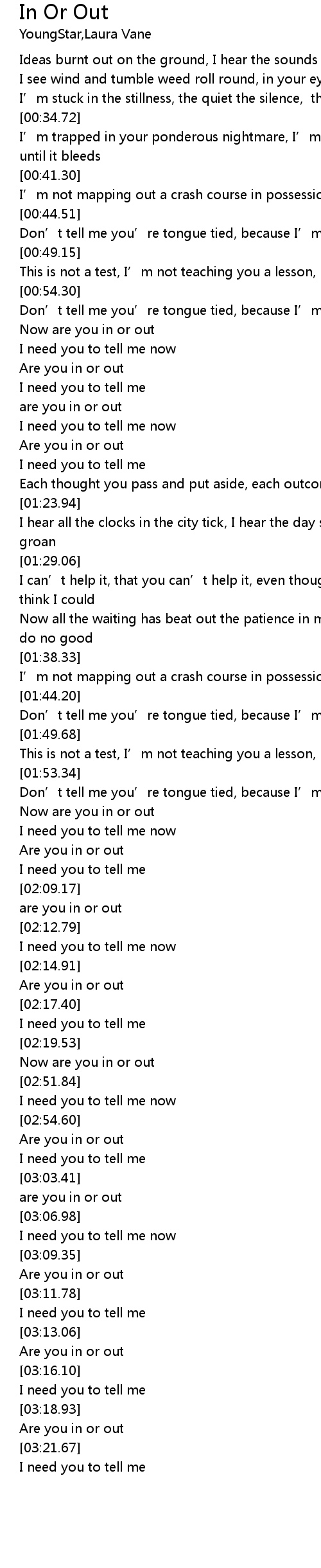 | [03:00.66] | Are you in or out |