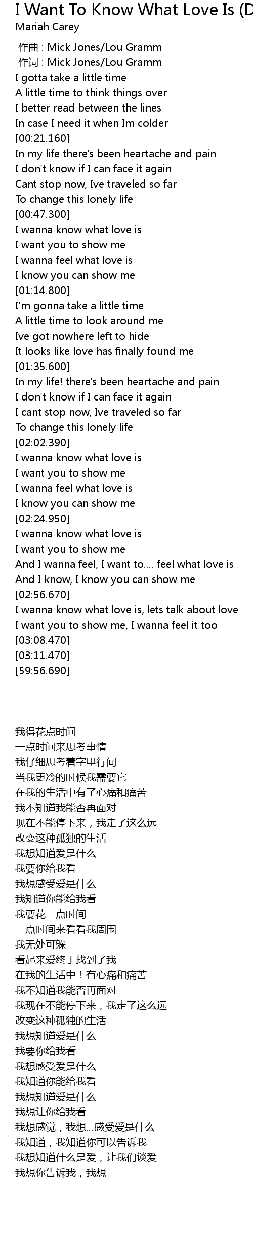 | [02:03.390] | I wanna know what love is |