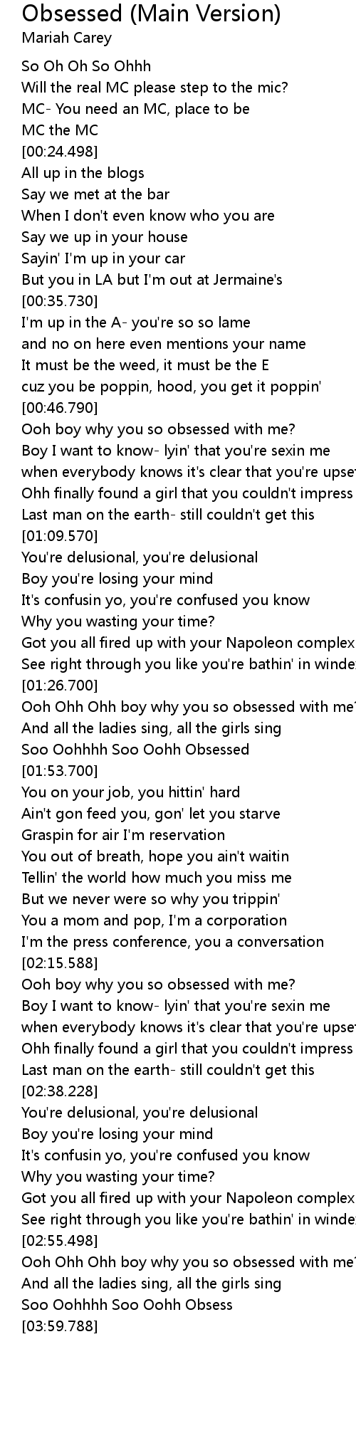| [02:55.988] | Ooh Ohh Ohh boy why you so obsessed with me? |