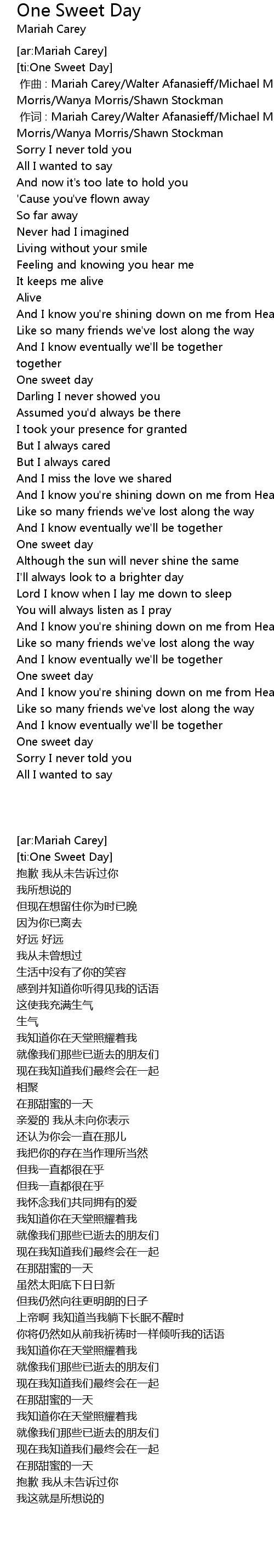 | [00:01.00] | 作词 : Mariah Carey/Walter Afanasieff/Michael McCary/Nathan Morris/Wanya Morris/Shawn Stockman |