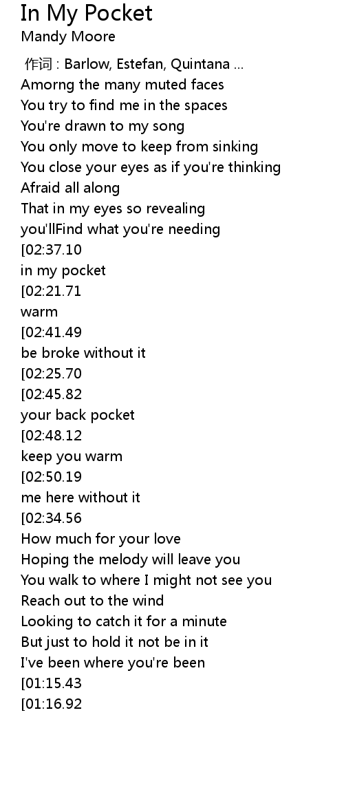 | [03:03.50][02:45.82][02:28.22][01:44.15][01:26.44][00:47.04] | Slip my heart in your back pocket |