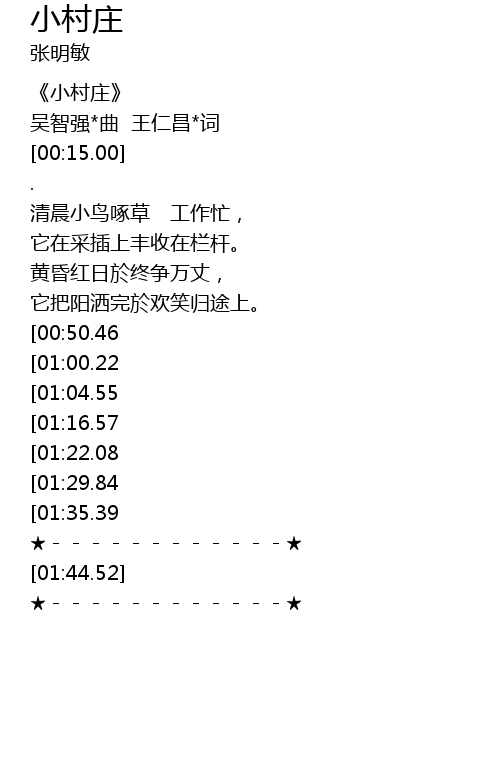 | [02:40.62][01:35.39] | 像深情常相思永在小村庄。 |