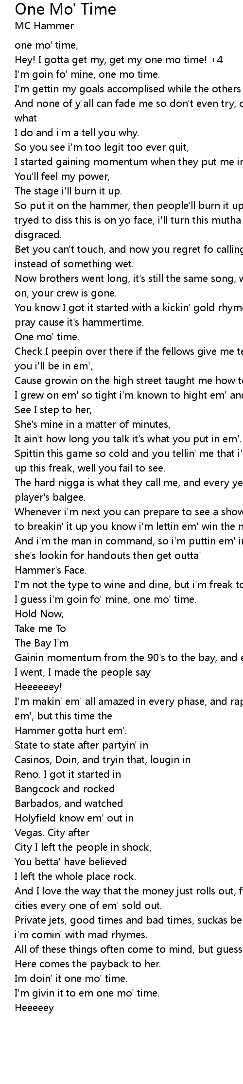 You know I got it started with a kickin' gold rhyme, suckas betta' pray cause it's hammertime. |
