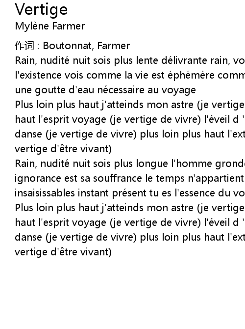 | Plus loin plus haut j' atteinds mon astre je vertige de vivre plus loin plus haut l' esprit voyage je vertige de vivre l'e veil d ' un sens l' instinct d' une danse je vertige de vivre plus loin plus haut l' extase et l' immensite je vertige d' tre vivant | |