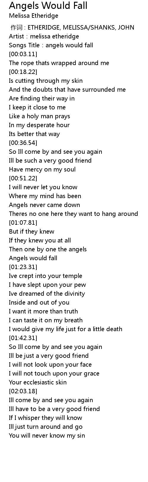 | [00:00.00] | 作词 : ETHERIDGE, MELISSA/SHANKS, JOHN |