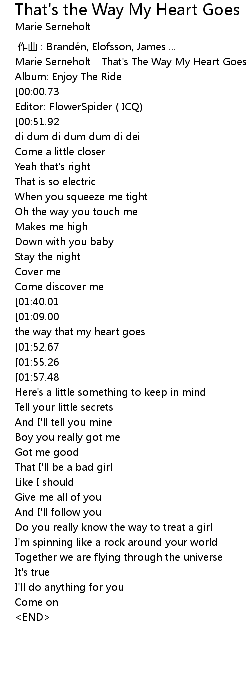 | [00:54.36][01:09.00][01:47.97][02:02.61][02:46.45][03:00.99][03:05.92][03:20.42] | That' s the way that my heart goes |