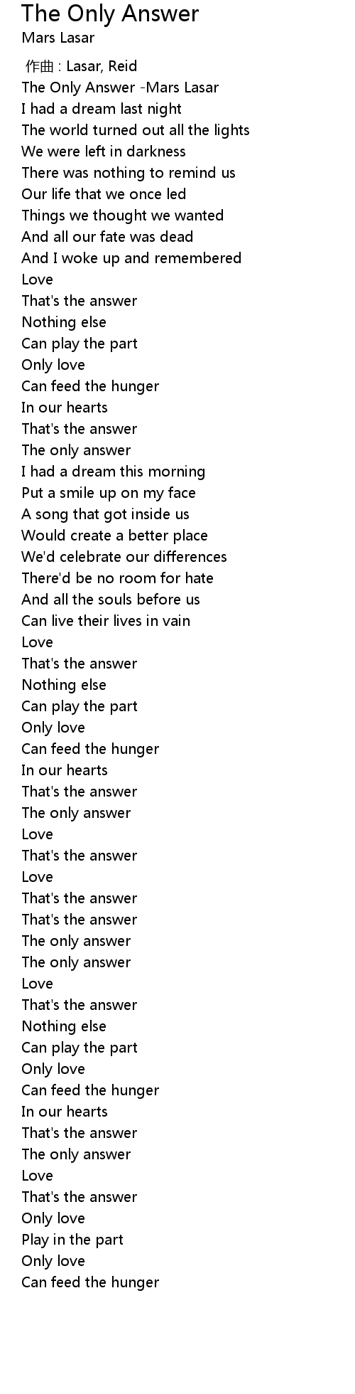 | [00:00.412] | The Only Answer -Mars Lasar |