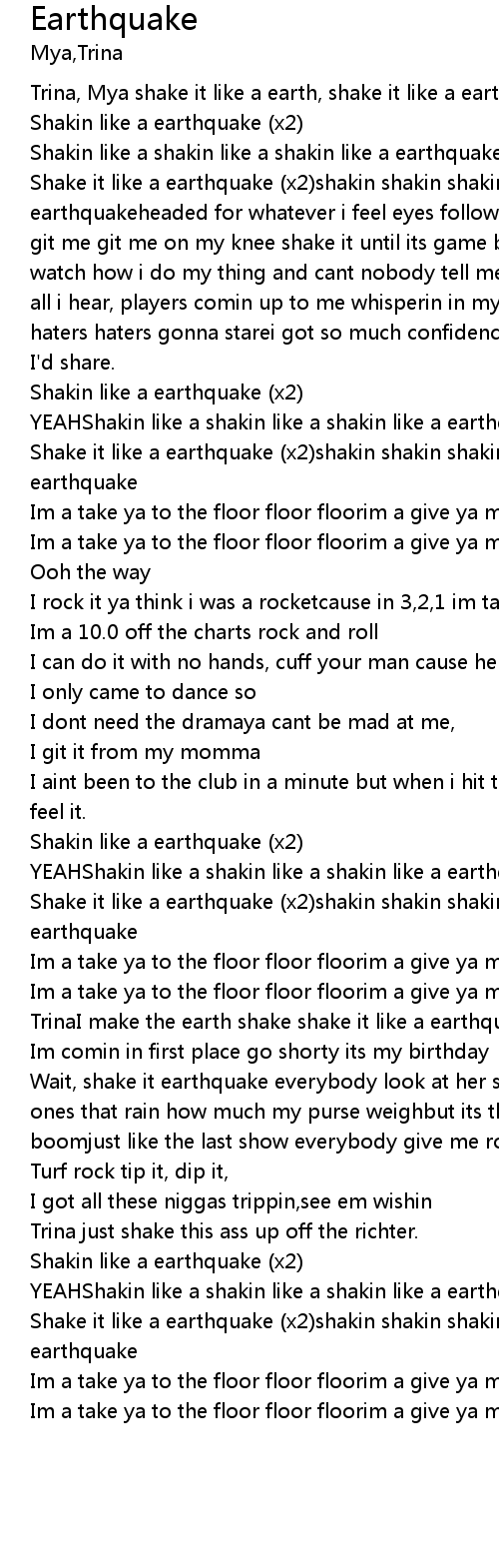 Wait, shake it earthquake everybody look at her snake, the earth brake i got em ones that rain how much my purse weighbut its this ass go ass hit the floor boomjust like the last show everybody give me room