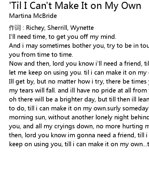 | Ill get by, but no matter how i try, there be times you know i call, chances are my tears will fall. and ill have no pride at all from time to time. but they say, oh there will be a brighter day, but till then ill lean on you, thats all i need to do, till i can make it on my own. surly someday ill look up and see the morning sun, without another lonely night behind me. but no on knows im over you, and all my cryings down, no more hurting memories can find me. but till then, lord you know im gonna need a friend, till i get use to losing you, let me keep on using you, till i can make it on my own... till i can make it on my own. |