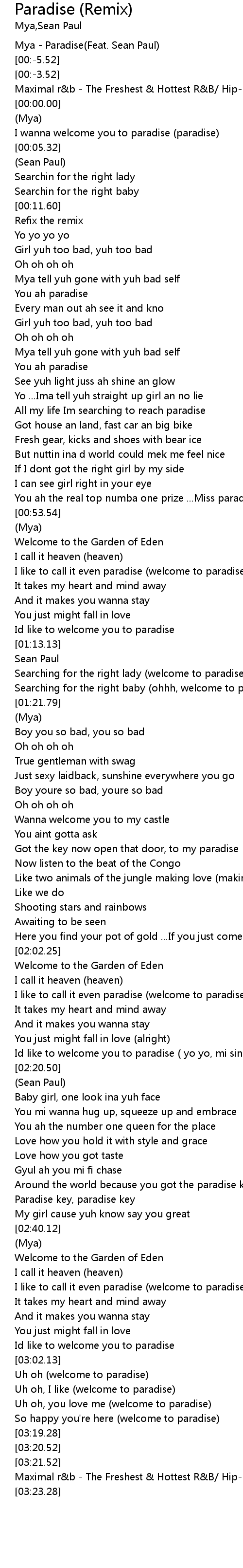 | [00:-7.52] | Mya - Paradise(Feat. Sean Paul) |
