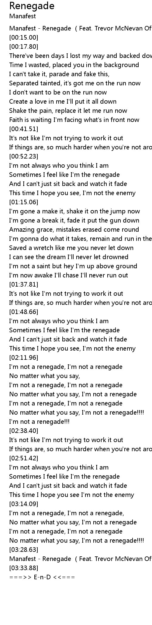 | [03:32.50] | Manafest - Renegade (Feat. Trevor McNevan Of Thousand Foot Krutch) |