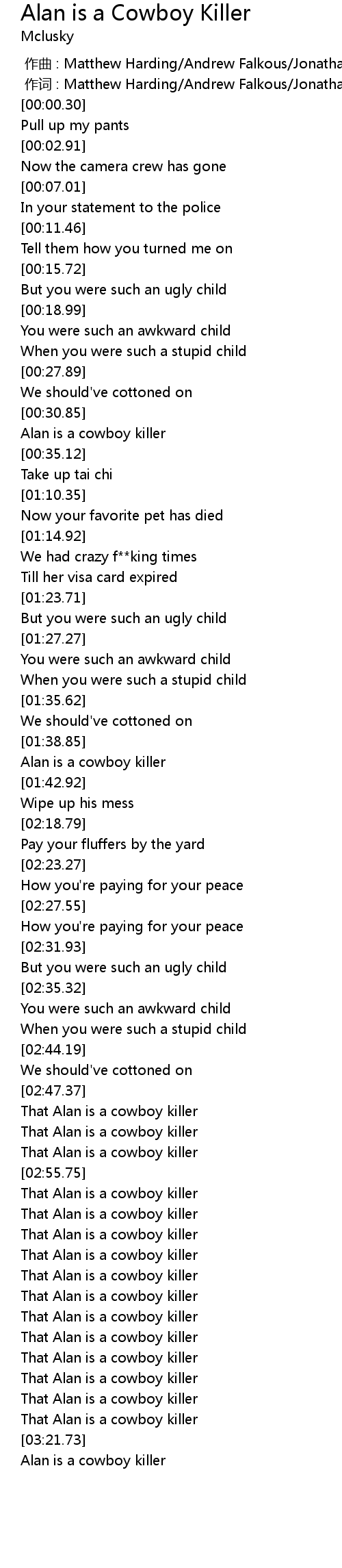 | [02:54.01] | That Alan is a cowboy killer |