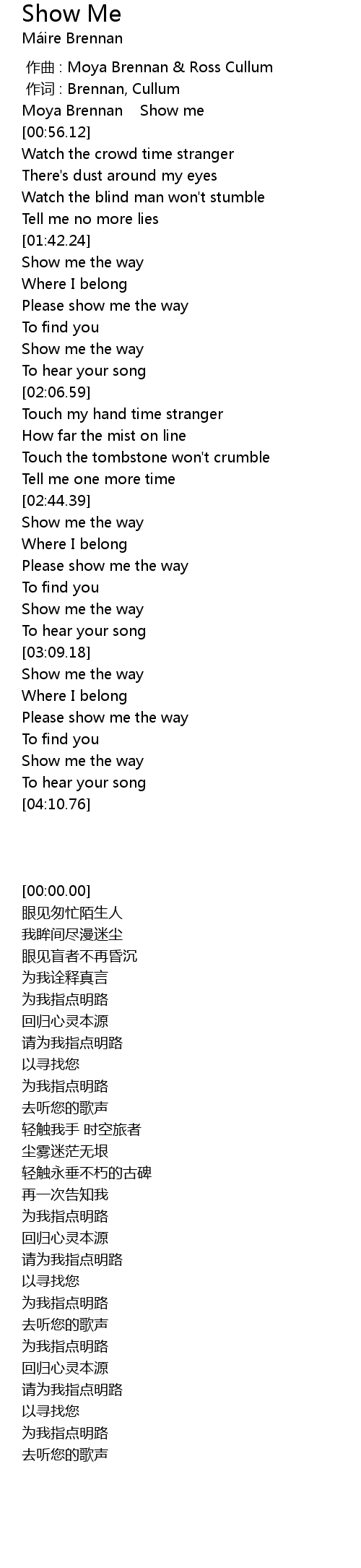 | [00:00.00] | Moya Brennan Show me |