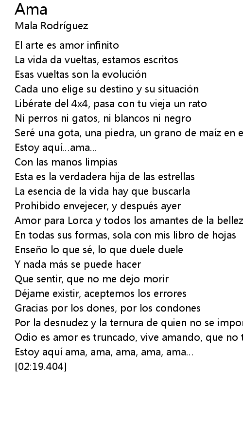 | [02:07.657] | Estoy aquí ama, ama, ama, ama, ama… |