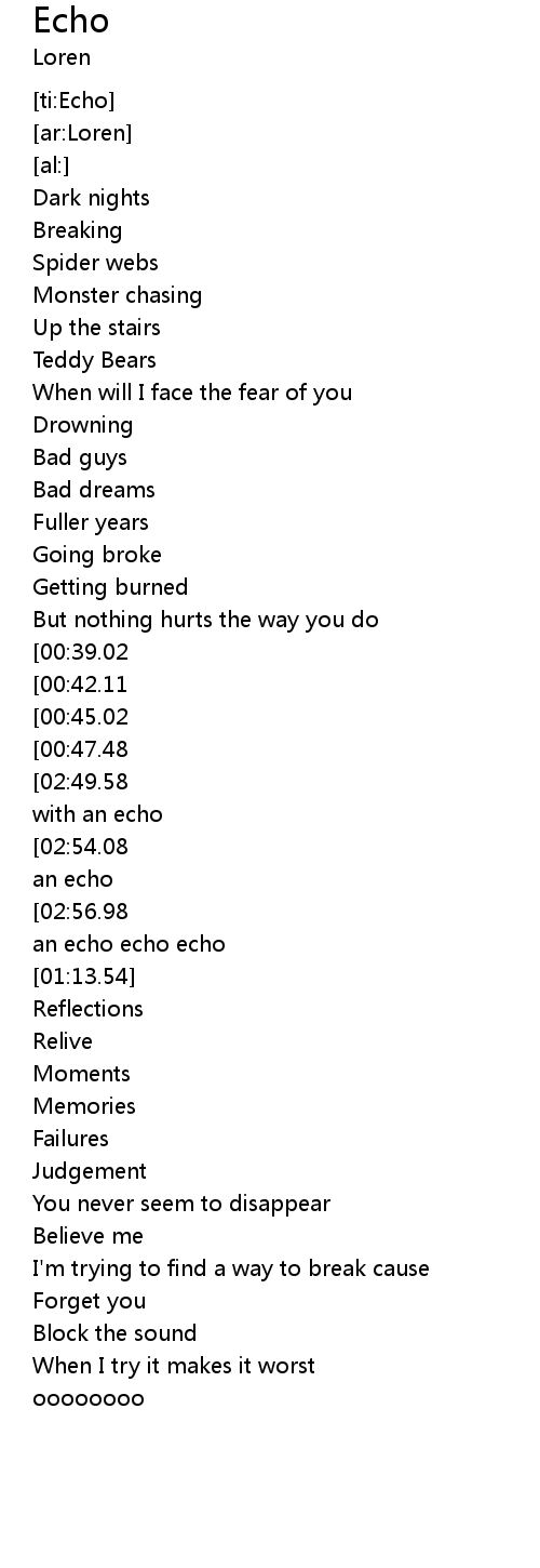 | [03:08.94][02:56.98][02:20.90][02:08.96][01:09.19][00:57.04] | Still in love with an echo echo echo |
