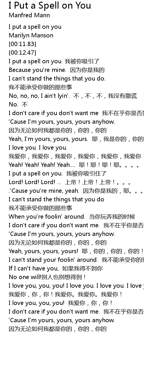 | [00:16.23] | I put a spell on you wǒ bèi nǐ xī yǐn le |