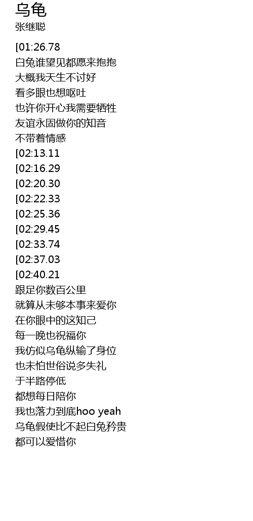 | [00:15.00][01:26.78][03:21.48] | 张继聪-乌龟(粤) |