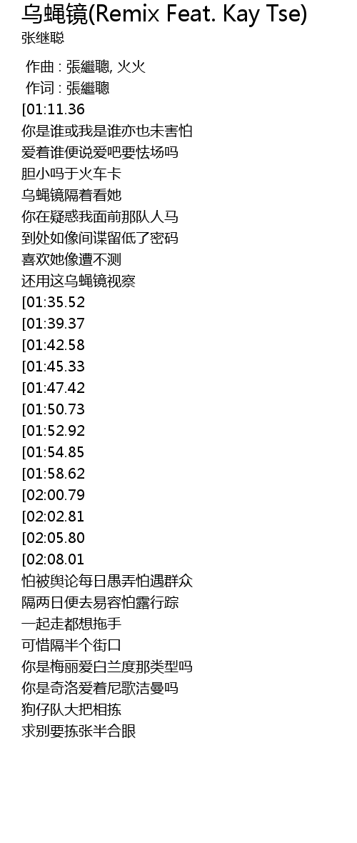 | [00:13.00][01:11.36][02:11.82][03:05.46] | 张继聪-乌蝇镜(粤) |