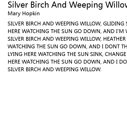 | SILVER BIRCH AND WEEPING WILLOW, GLIDING SWAN AND SURFING SWALLOW I'M STANDING HERE WATCHING THE SUN GO DOWN, AND I'M WONDR'ING IF HE WILL COME. | |