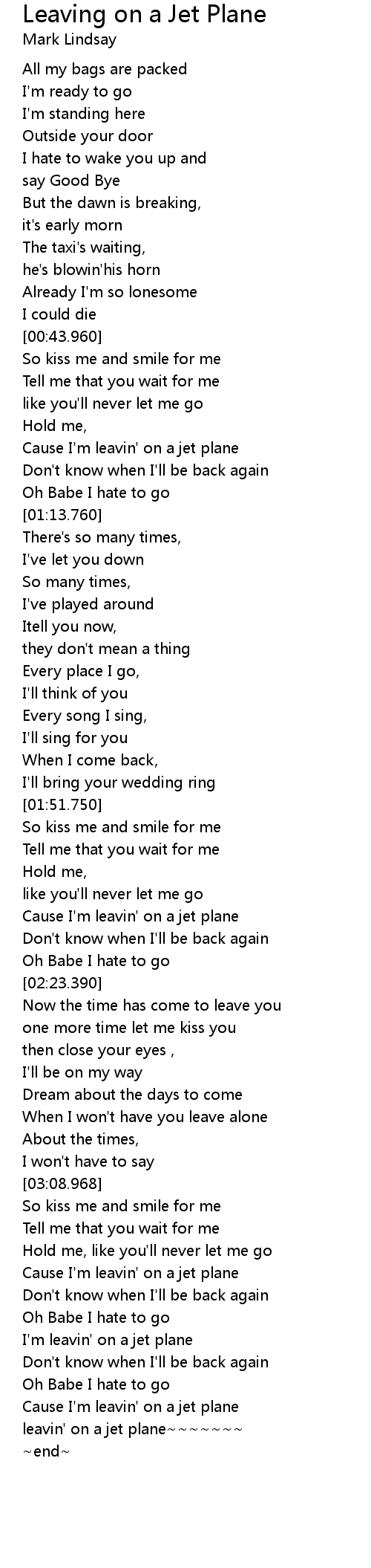 [04:01.168] leavin' on a jet plane~~~~~~~