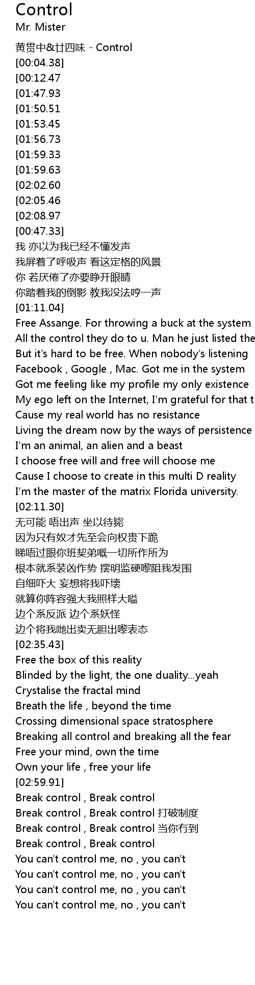 | [03:23.92] | Break control , Break control 当你冇到 |