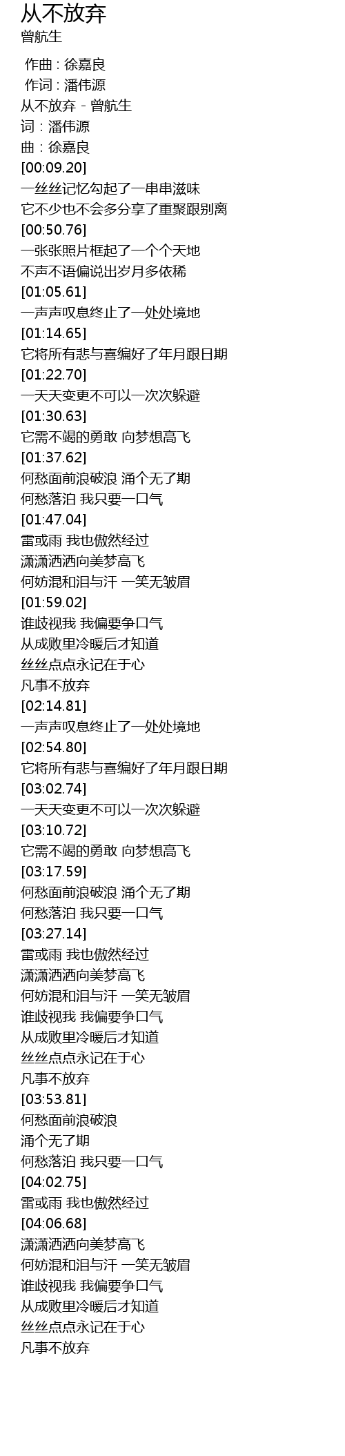 | [00:01.34] | 从不放弃 - 曾航生 |