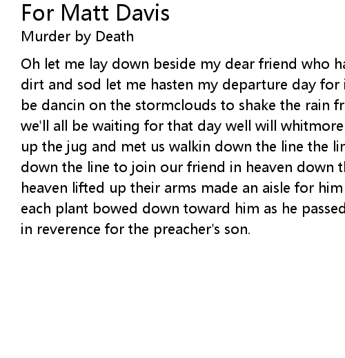 Oh let me lay down beside my dear friend who has gone away cover me over with dirt and sod let me hasten my departure day for i long for that day when we'll be dancin on the stormclouds to shake the rain from the sky onto our graves we'll all be waiting for that day well will whitmore mixed up some shine filled up the jug and met us walkin down the line the line the line he met us walkin down the line to join our friend in heaven down the line and every chain gang in heaven lifted up their arms made an aisle for him to walk between the rows and each plant bowed down toward him as he passed as he passed they kept their necks in reverence for the preacher's son. |