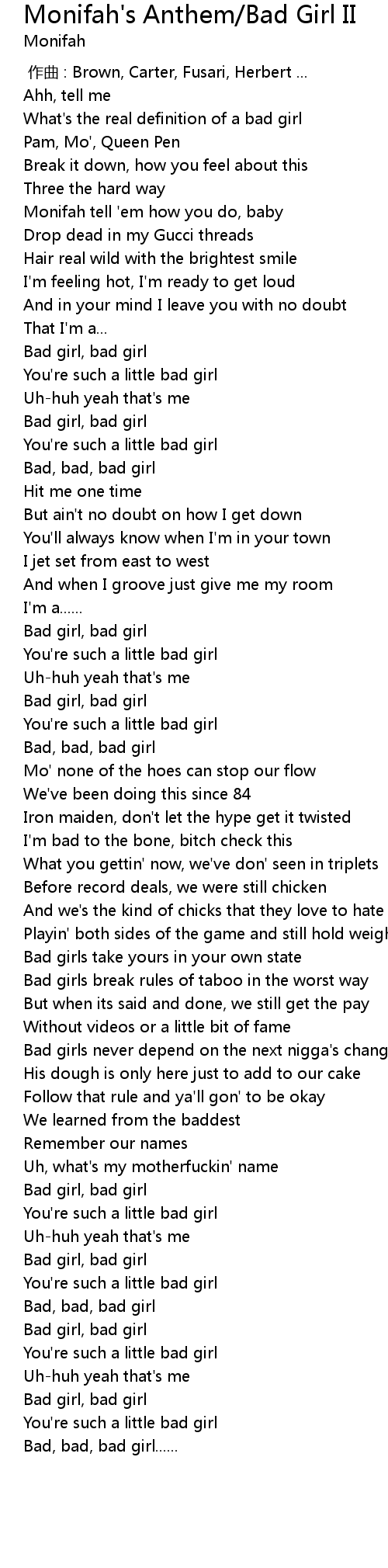 | [01:56.01] | Bad girls never depend on the next nigga' s change |