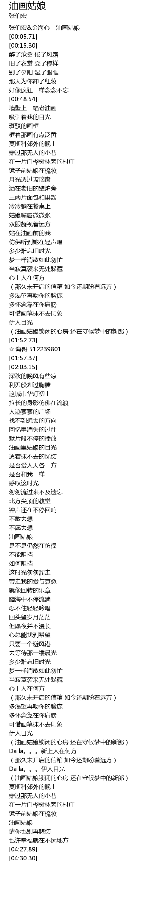 | [00:01.16] | 张伯宏&金海心 - 油画姑娘 |