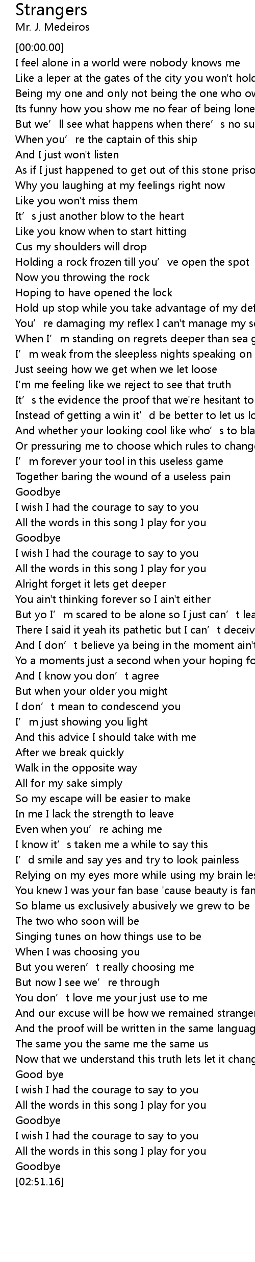 | [02:14.22] | And our excuse will be how we remained strangers |