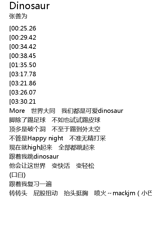 | [03:08.60][01:35.50][00:42.16] | gēn zhe wǒ dinosaur yì qǐ lái dinosaur |