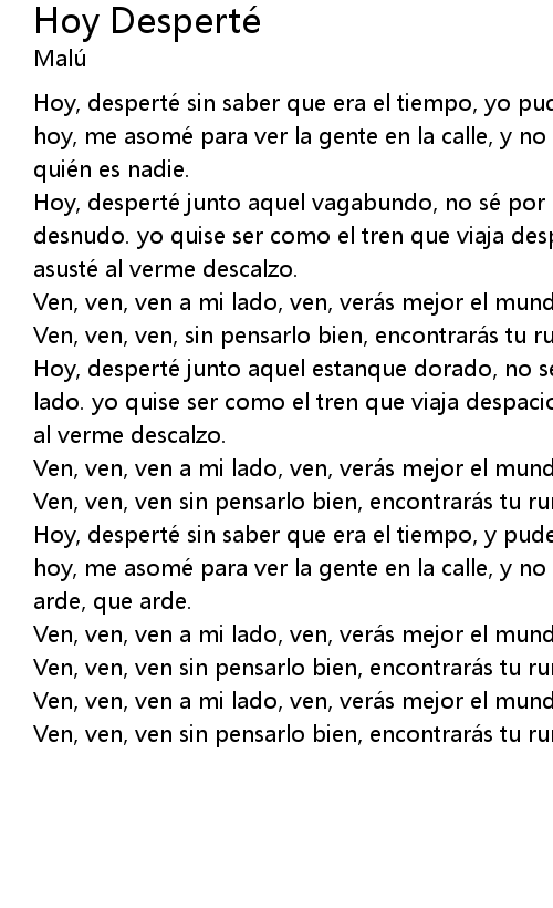 | Hoy, desperte junto aquel estanque dorado, no se por que te deje al otro lado. yo quise ser como el tren que viaja despacio, y yo sin querer me asuste al verme descalzo. | |