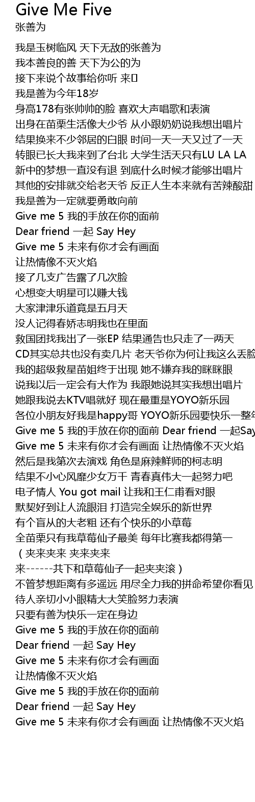 | [01:55.55] | Give me 5 我的手放在你的面前 Dear friend 一起Say Hey |