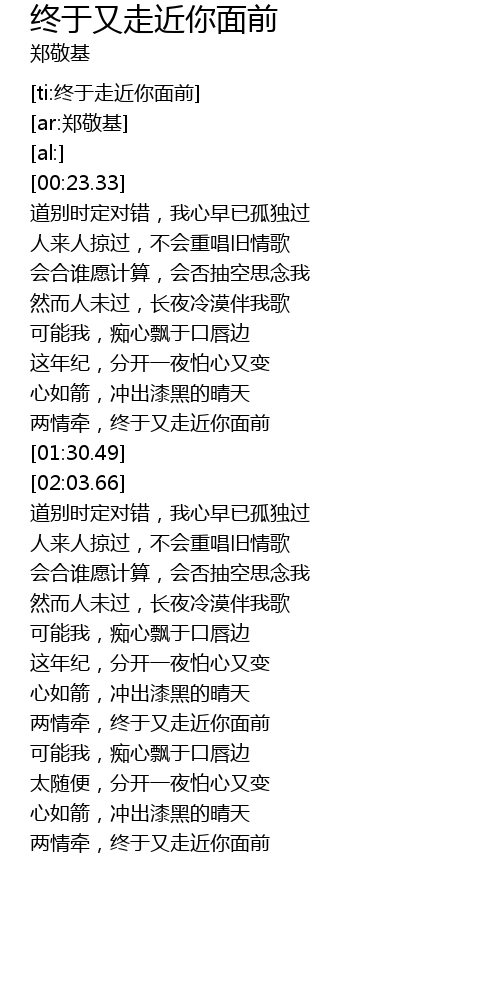 | [03:33.64] | liang qing qian, zhong yu you zou jin ni mian qian |