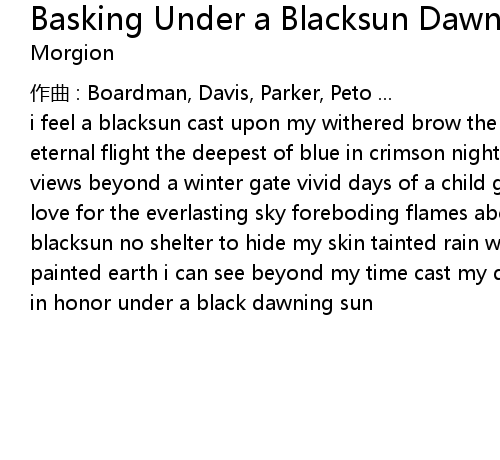 | i feel a blacksun cast upon my withered brow the dancing of embers peace of eternal flight the deepest of blue in crimson night shadows my russet skin in views beyond a winter gate vivid days of a child green are the trees of age my love for the everlasting sky foreboding flames abode i will dream under a blacksun no shelter to hide my skin tainted rain will taste so pure like black painted earth i can see beyond my time cast my disgrace on fall foretell my name in honor under a black dawning sun |