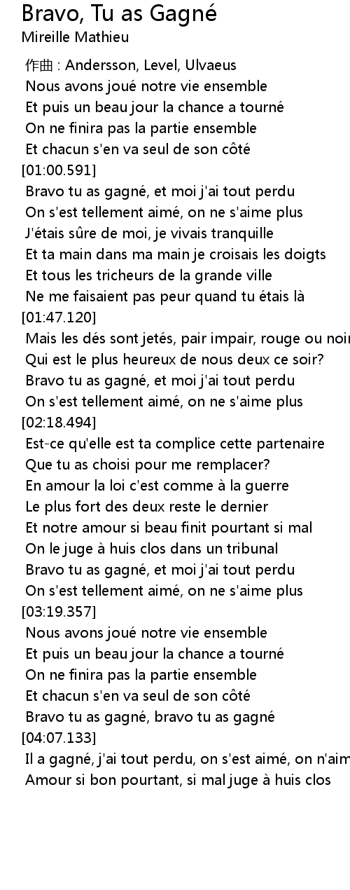 | [02:03.305] | Bravo tu as gagne, et moi j' ai tout perdu |