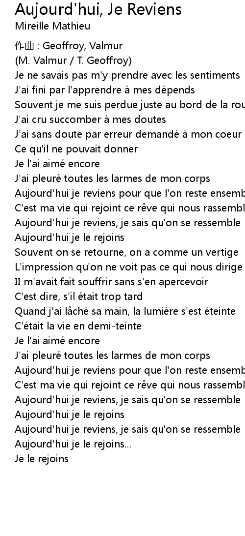 | Aujourd'hui je reviens, je sais qu'on se ressemble | |
