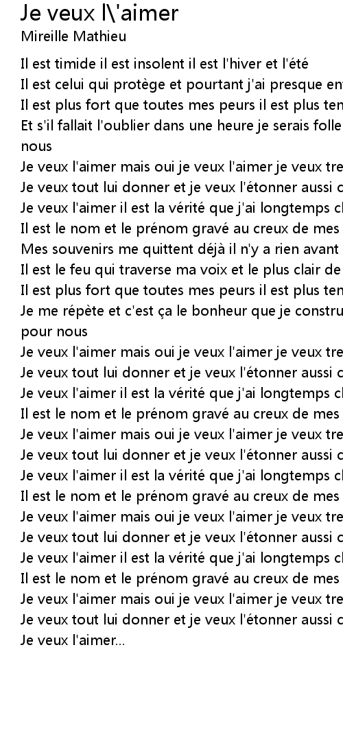 | Je veux tout lui donner et je veux l'é tonner aussi car je veux qu' il m' aime | |