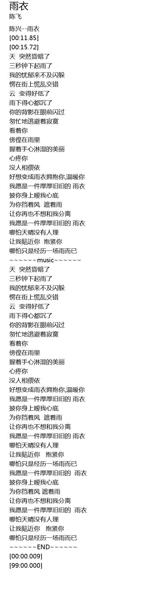 | [03:15.26] | 我愿是一件厚厚旧旧的 雨衣 |