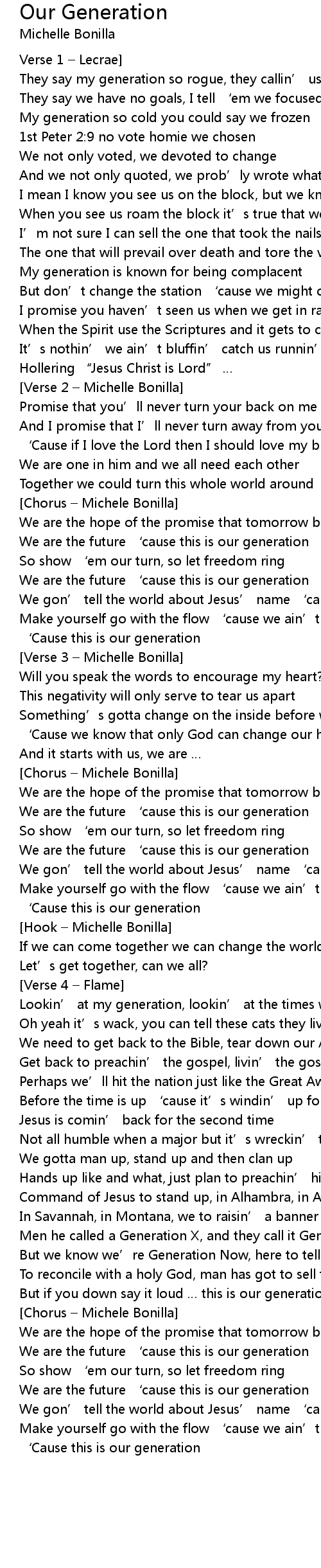 | We gon' tell the world about Jesus' name ' cause this is our generation | |