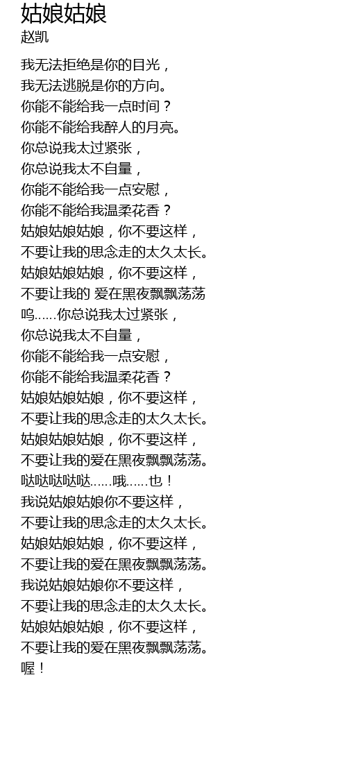 | [01:14.740] | gū niáng gū niáng gū niáng, nǐ bú yào zhè yàng, |
