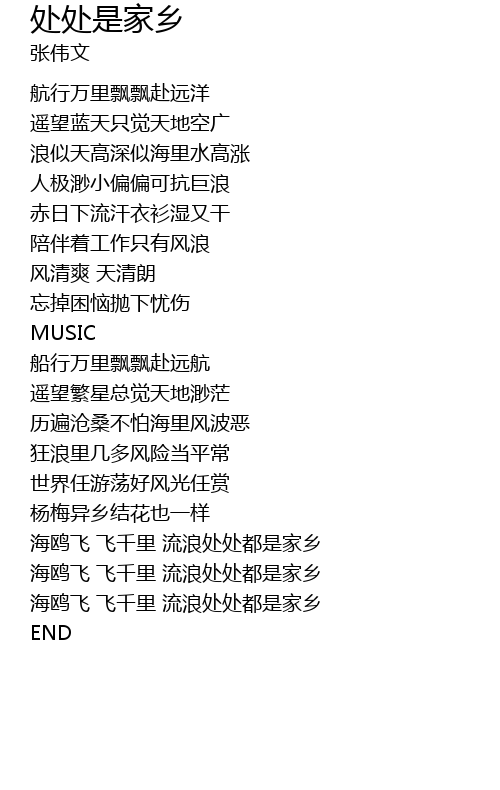 | [00:20.68] | 航行万里飘飘赴远洋 |